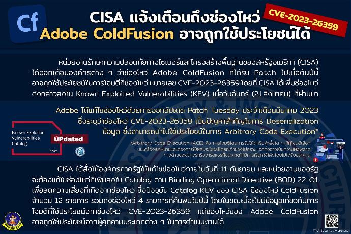 สหรัฐอเมริกา (CISA) ได้ออกตือนองค์กรต่างๆ ว่าช่องโหว Adobe ColdFusion