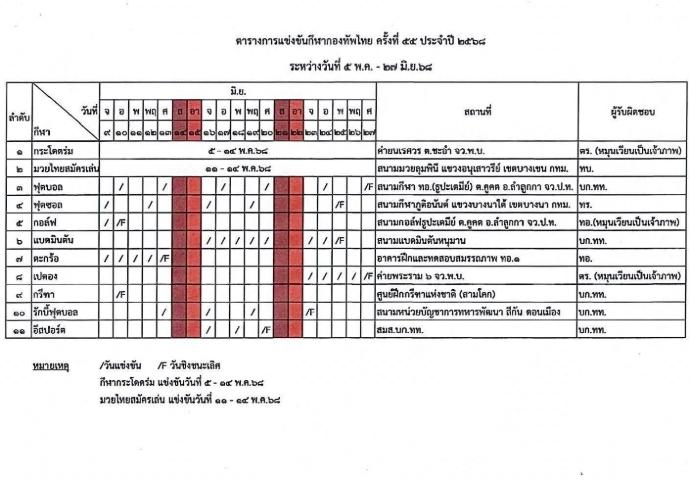 2. กีฬาฟุตบอล ทำการแข่งขัน ณ สนามกีฬา ทอ.(ธูปะเตมีย์) ระหว่างวันที่ 10 - 27 มิถุนายน 2568
