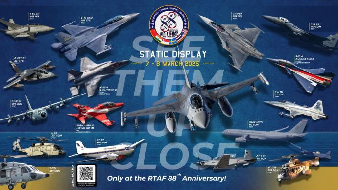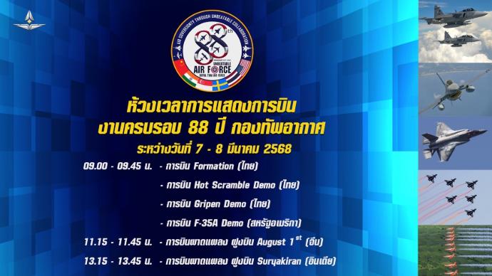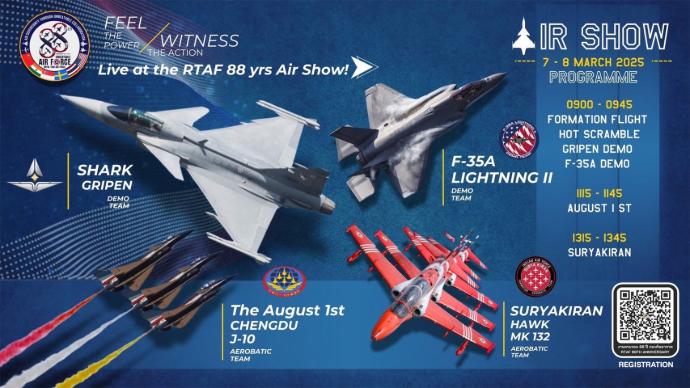 ครั้งแรกกับ International Air Show ของฝูงบินผาดแผลงระดับโลก ฝูงบิน August First จากกองทัพอากาศ สาธารณรัฐประชาชนจีน ฝูงบิน Suryakiran จากกองทัพอากาศ สาธารณรัฐอินเดีย การแสดงการบินของเครื่องบิน F-35 Demo Team จากกองทัพอากาศ สหรัฐอเมริกา ตื่นเต้นเร้าใจ กับการแสดงการบิน ของเครื่องบิน F-16 และ Gripen จากกองทัพอากาศ พร้อมการตั้งแสดงอากาศยาน จำนวน 28 แบบ 29 เครื่อง ชมงานเสวนาวิชาการและนิทรรศการ ที่น่าสนใจอีกมากมายแล้วพบกัน 7-8 มีนาคม 2568 เหนือน่านฟ้า กองบิน 6 ดอนเมือง