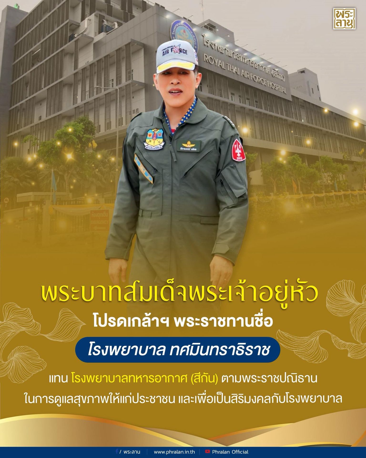 โปรดเกล้าฯ พระราชทานชื่อ “โรงพยาบาลทศมินทราธิราช” แทน รพ.ทหารอากาศ (สีกัน) เชื่อมโยง “รพ.ภูมิพลอดุลยเดช” พระนาม ร.9 ทอ. ทำหนังสือขอพระราชทานชื่อใหม่ ขึ้นไปเมื่อวันที่ 16 พฤษภาคม ผู้สื่อข่าวรายงานว่า เมื่อวันที่ 14 พฤษภาคม สำนักพระราชวัง ได้มีหนังสือถึง พล.อ.อ.พันธ์ภักดี พัฒนกุล ผู้บัญชาการทหารอากาศ (ผบ.ทอ.) อ้างถึงหนังสือ กองทัพอากาศ ที่ขอพระราชทานชื่อใหม่ แก่โรงพยาบาลทหารอากาศ (สีกัน) กรมการแพทย์ทหารอากาศ กรุงเทพมหานคร เพื่อเฉลิมพระเกียรติ พระบาทสมเด็จพระเจ้าอยู่หัว ที่มีพระราชปณิธานในการดูแลสุขภาพให้แก่ประชาชน และเพื่อเป็นสิริมงคลโรงพยาบาลทหารอากาศ ใช้งบประมาณก่อสร้าง 950 ล้านบาทถ้วนเพื่อให้บริการแก่กำลังพลของกองทัพอากาศและครอบครัวตลอดจนประชาชนทั่วไปในพื้นที่กรุงเทพมหานคร ตอน โดยการให้บริการเชื่อมโยงกับโรงพยาบาลภูมิพล ซึ่งเป็นโรงพยาบาลหลักของกองทัพอากาศ เปิดให้บริการเมื่อปี 2562 ปัจจุบันมีผู้ป่วยเข้ารับบริการทั้งสิ้น 660,915 คน เพื่อเป็นการเฉลิมพระเกียรติพระบาทสมเด็จพระเจ้าอยู่หัว ที่มีพระราชปณิธานในการดูแลสุขภาพให้ประชาชน และเพื่อเป็นสิริมงคลพระบาทสมเด็จพระเจ้าอยู่หัวฯ ทรงโปรดเกล้า พระราชทานชื่อใหม่แก่ โรงพยาบาลทหารอากาศ (สีกัน) ว่า “โรงพยาบาลทศมินทราธิราช” อ่านว่า โรง-พะ-ยา-บาน-ทะ -สะ- มิน -ทรา-ทิ – ราด หมายความว่า โรงพยาบาลที่สร้างขึ้น เพื่อ เฉลิม เกียรติ พระบาทสมเด็จพระเจ้าอยู่หัว ผู้เป็นพระราชาที่ยิ่งใหญ่ (รัชกาลที่10)