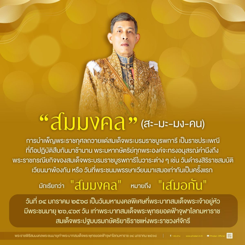 ในวันที่ 14 มกราคม พ.ศ. 2568 ประเทศไทยจะมีการจัดพระราชพิธีสำคัญ นั่นคือ “พิธีสมมงคล” ซึ่งเป็นกิจกรรมเฉลิมพระเกียรติ พระบาทสมเด็จพระเจ้าอยู่หัว เนื่องในโอกาสพระราชพิธีสมมงคลพระชนมายุ 26,469 วัน เท่าพระบาทสมเด็จพระพุทธยอดฟ้าจุฬาโลกมหาราช สมเด็จพระปฐมกษัตริยาธิราชแห่งพระราชวงศ์จักรี โดยรัฐบาลได้เชิญชวนประชาชนร่วมกิจกรรมต่าง ๆ ที่จะจัดขึ้นในวันดังกล่าวด้วย