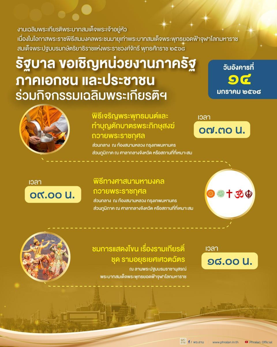 นายจิรายุ ห่วงทรัพย์ โฆษกประจำสำนักนายกรัฐมนตรี เปิดเผยว่า นางสาวแพทองธาร ชินวัตร นายกรัฐมนตรี ได้เชิญชวนคนไทยร่วมเป็นส่วนหนึ่งของ "พระราชพิธีสมมงคล" ซึ่งรัฐบาลได้จัดงานเฉลิมพระเกียรติพระบาทสมเด็จพระเจ้าอยู่หัว เนื่องในโอกาสพระราชพิธีสมมงคลพระชนมายุเท่ากับพระบาทสมเด็จพระพุทธยอดฟ้าจุฬาโลกมหาราช รัชกาลที่ 1 ในวันที่ 14 มกราคม 2568 ประกอบด้วย 7 กิจกรรม ได้แก่