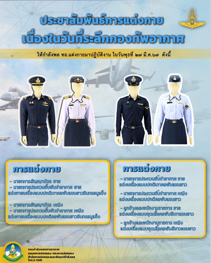 ประชาสัมพันธ์การแต่งกาย “เนื่องในวันที่ระลึกกองทัพอากาศ” ให้กำลังพลกองทัพอากาศแต่งกายมาปฏิบัติงานในวันพุธที่ 27 มีนาคม 2567 ดังนี้
