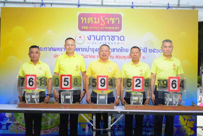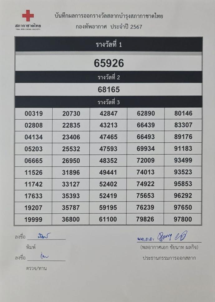 สำหรับผลการออกรางวัลสลากบำรุงสภากาชาดไทย กองทัพอากาศ ประจำปี 2567 มีดังนี้ - รางวัลที่ 1 รถยนต์ TOYOTA NEW CAMRY 2.5 HEV PREMIUM LUXURY 2025 จำนวน 1 รางวัล ได้แก่ สลากหมายเลข 65926 - รางวัลที่ 2 รถยนต์ TOYOTA NEW YARIS 1.2 SPORT จำนวน 1 รางวัล ได้แก่ สลากหมายเลข 68165 - รางวัลที่ 3 ทองคำแผ่นหนัก 1 สลึง จำนวน 50 รางวัล ได้แก่ สลากหมายเลข 00319 / 02808 / 04134 /05203 / 06665 / 11526 / 11742 / 17633 / 19207 / 19999 / 20730 / 22835 / 23406 /25532 / 26950 / 31896 /33127 / 35393 / 35787 / 36800 / 42847 / 43213 / 47465 /47593 / 48352 / 49441 / 52402 / 52419 / 59195 / 61100 / 62890 / 66439 /66493 /69934 / 72009 / 74013 / 74922 /75653 / 76239/ 79826 / 80146 / 83307 /89176 /91183 / 93499 / 93523 / 95853 / 96292 / 97650 / 97800 ทั้งนี้ สามารถตรวจผลการออกรางวัลได้ที่ www.rtaf.mi.th ผู้มีสิทธิ์รับรางวัลจะต้องเป็นผู้ถือ สลากฉบับที่ถูกรางวัลเท่านั้น โดยกรุณานำบัตรประจำตัวประชาชนมาติดต่อรับรางวัลได้ที่สำนักงานสลากกาชาดกองทัพอากาศ (กองประชาสัมพันธ์ กรมกิจการพลเรือนทหารอากาศ ถนนพหลโยธิน แขวงสนามบิน เขตดอนเมือง กรุงเทพฯ) ภายในวันที่ 22 มีนาคม 2568 หลังพ้นกำหนดแล้วถือว่าสละสิทธิ์ในการรับรางวัล และมอบรางวัลนั้นให้สภากาชาดไทยรายละเอียดเพิ่มเติม โทร.0 25340800
